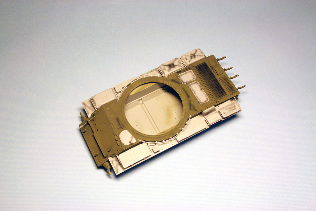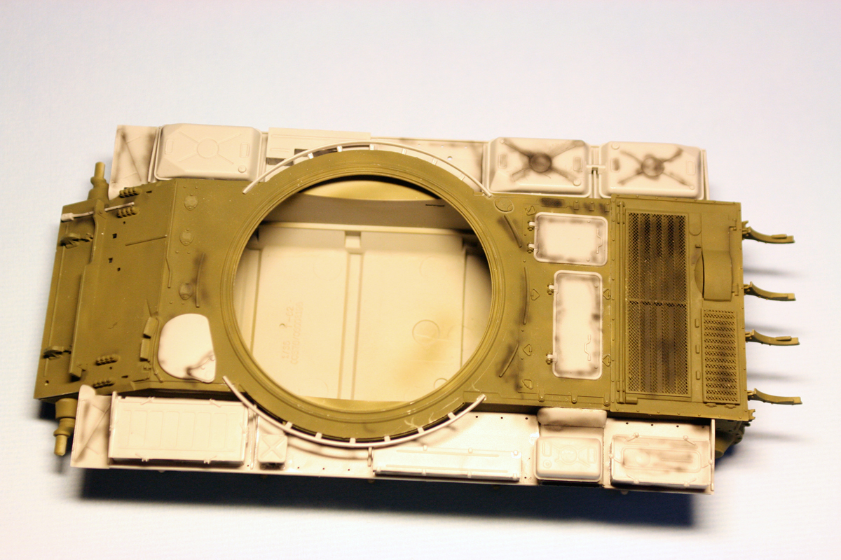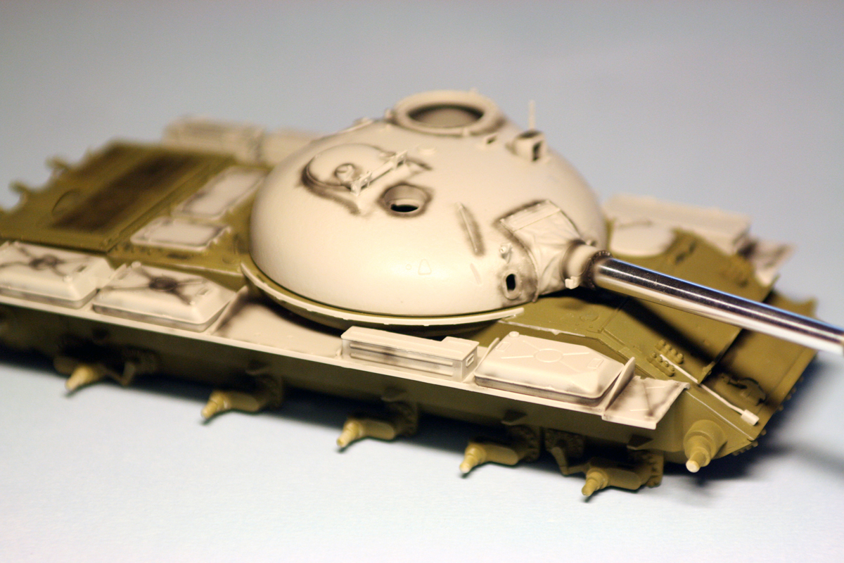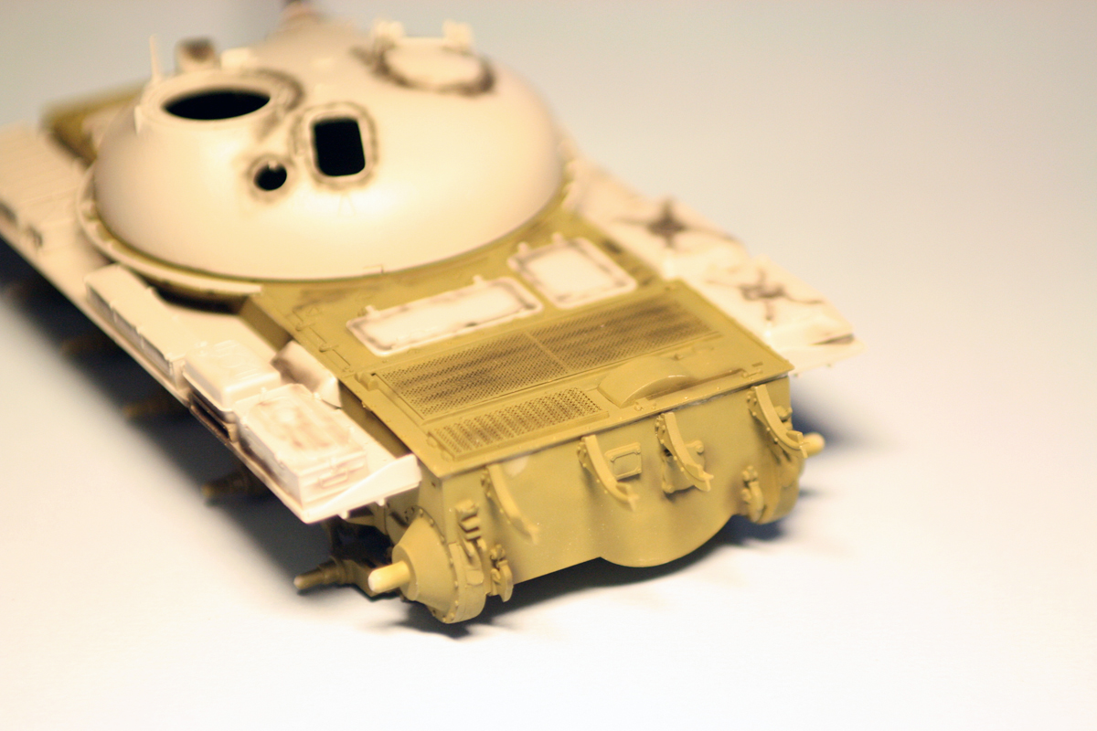 были приобретены MIGовские смывки для Советской/Российской БТТ. то, что по идее должно было давать серый оттенок на зеленом оказалось жидкостью для запыления. в итоге, танк запылен.