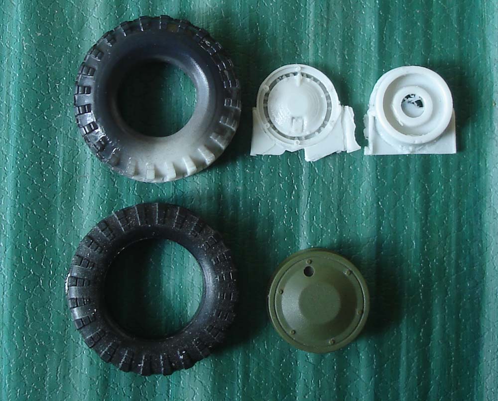 В подарок для этой модели, коллега прислал мне смоляные колёса. Фирму не знаю. Первый раз работаю с фирменными деталями из смолы. Обрабатываются легко, что мне понравилось. Провёл примерку на модели.