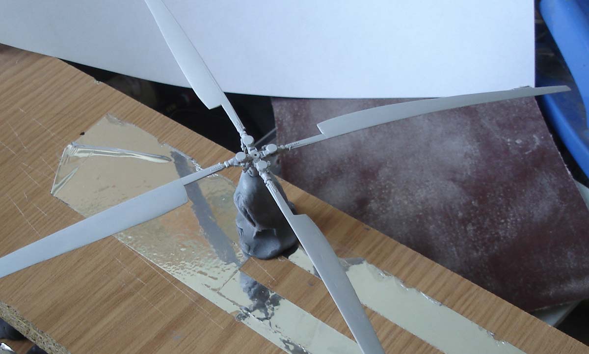 Примерка передних лопастей. Ещё не крашено, лопасти не приклеены, вал не доработан.